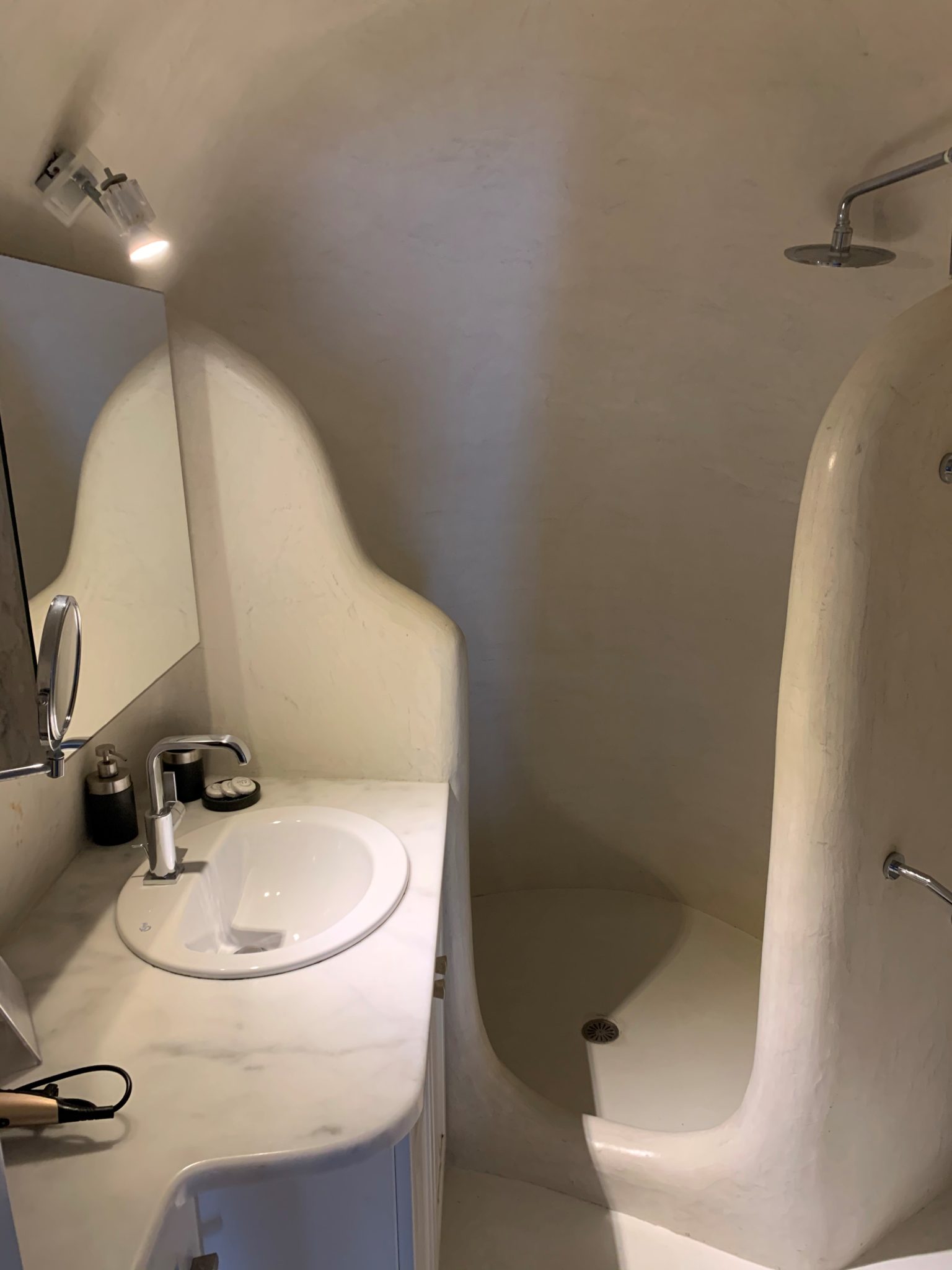 Das Apartment ist landestypische aber modern eingerichtet und inmitten von Felsen gebaut. Es gibt ein Doppelbett und zwei durchaus vollwertige (ca. 80x200cm) Zustellbetten. Außerdem gibt es eine Küche, welche mit dem Nötigsten ausgestattet ist und ein kleiner Esstisch für 2 Personen. Das Bad ist etwas klein, verfügt aber über eine tolle Dusche. Eine Klimaanlage, ein Fernseher und WLAN sind sind natürlich auch vorhanden.