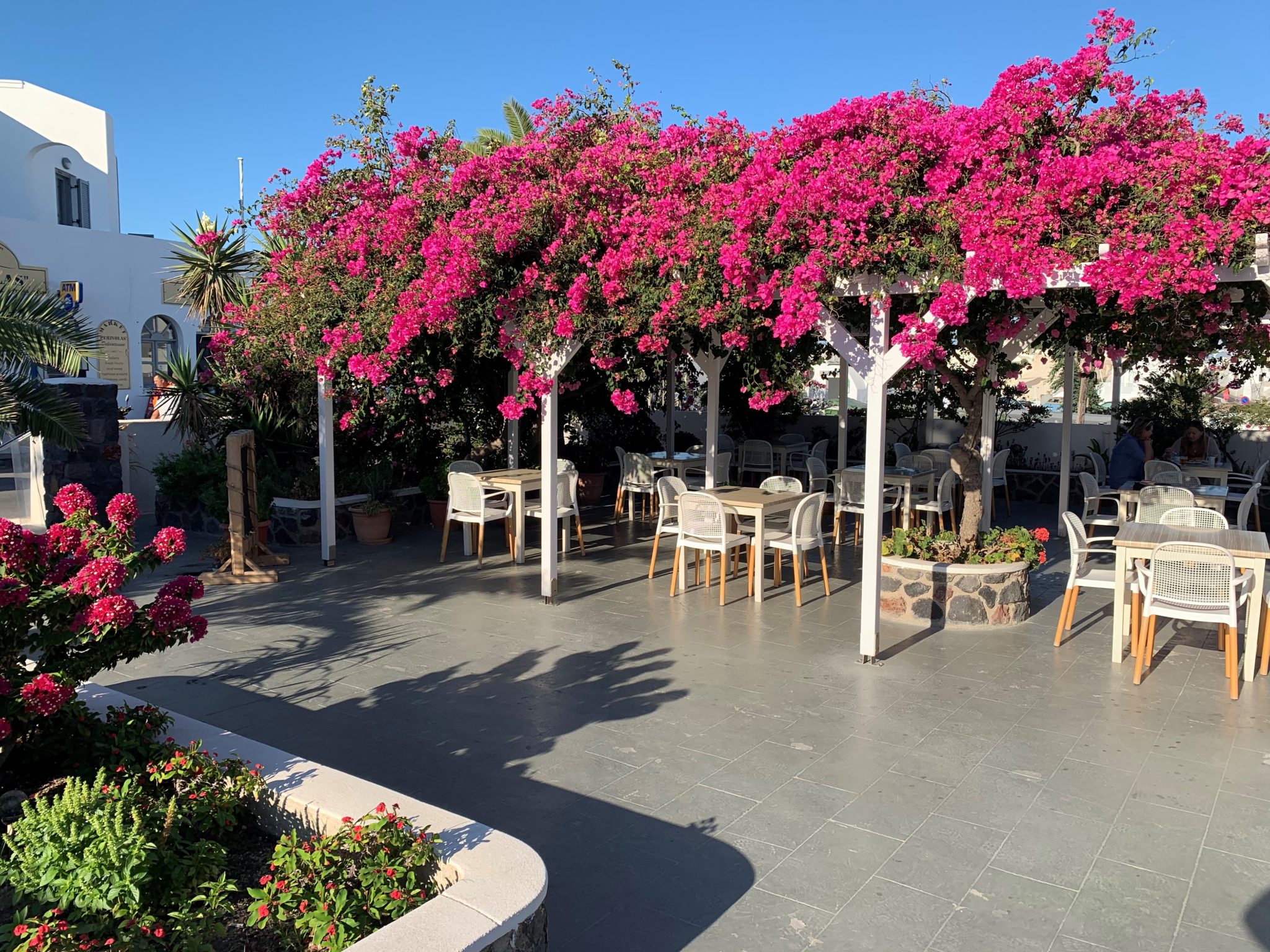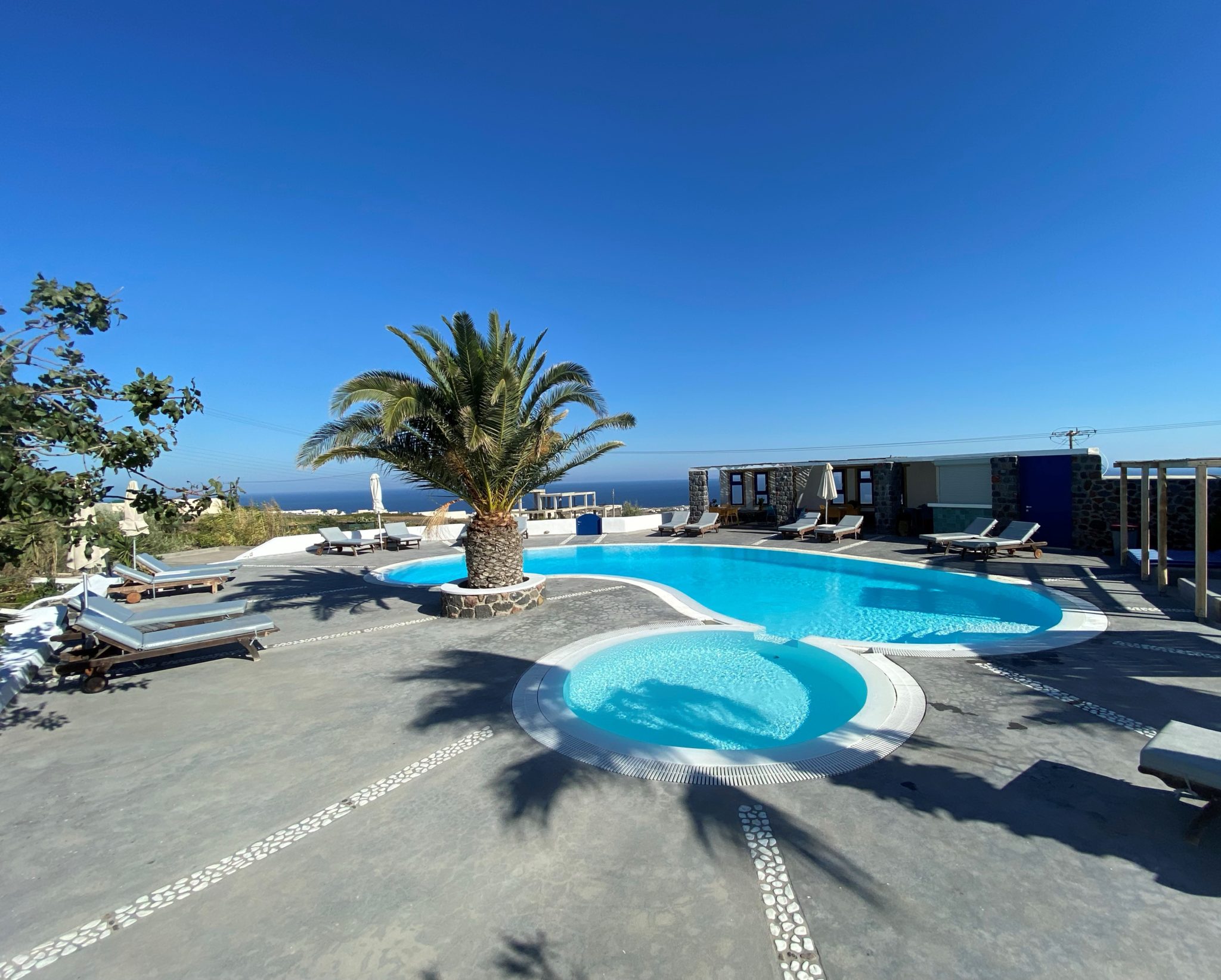 Die große und schöne Terrasse bietet einen atemberaubenden Blick auf das Meer, die Nachbarinsel Thirasia und die typische „Skyline“ aus weißen Häusern am Hang. Auf der Terrasse gibt es gemütliche Stühle, Liegestühle und einen Tisch mit Sonnenschirm. Von hier aus kann man die traumhaften Sonnenuntergänge besonders gut beobachten.